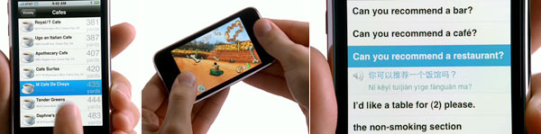 L'azienda famosa per dare servizi ai turisti è stata scelta perché il software in questione è gratuito e poi perché siamo in pieno tema cinese (per varie ragioni). L'iPhone 3G può "pronunciare" frasi in lingue straniere, in questo caso il mandarino, togliendoci dagli impicci quando non riusciamo a comunicare con il solo ausilio dell'inglese.