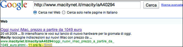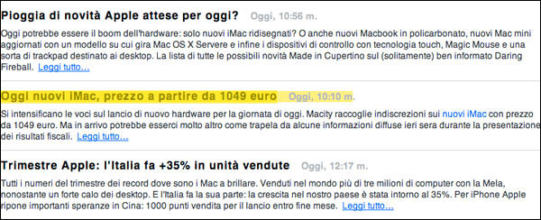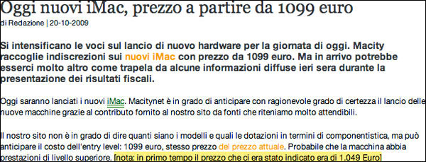 In serata, tra le 21 e le 22 arrivava nel feed RSS dello stesso sito la segnalazione di un nuovo articolo intitolato "Oggi nuovi iMac, prezzo a partire da 1099 euro". Ecco come si rimedia! Basta cambiare il titolo di una notizia che non è più notizia perché non c'è alcuno sconto da promettere ai boccaloni che leggono.