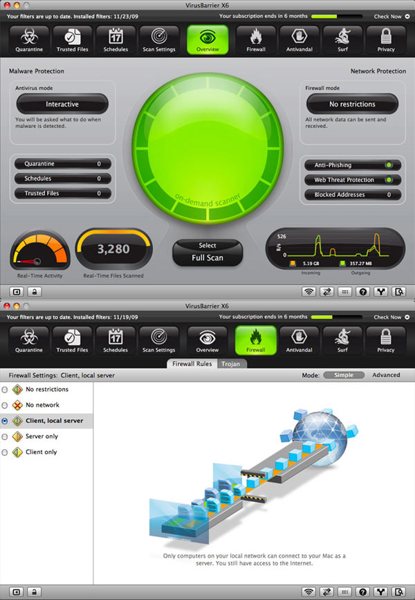 VirusBarrier X6 ora costa meno della precedente versione X5 e si può installare su due Mac. La grafica è sempre molto accattivante, accanto si vede il pannello che monitora tutto il traffico online, a seconda dei vari utilizzi.