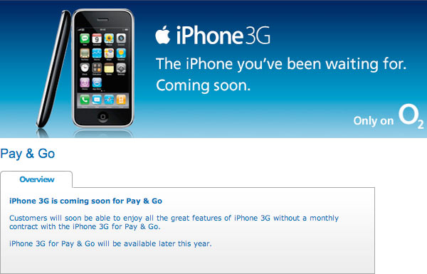 Da quel momento O2 aveva lasciato in attesa la clientela interessata ma, da questa mattina, il sito di riferimento pubblica l'indicazione che l'iPhone 3G pre-pay "Pay & Go" sarà disponibile in una fase successiva, entro l'anno in corso.