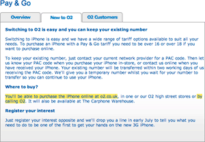 Come vedete dall'immagine accanto O2 annuncia che le vendite avverranno anche online ed al telefono, contrariamente alla nuova politica di vendere l'iPhone 3G solo nei negozi ufficiali (Apple Store, O2 Store, Carphone Warehouse).