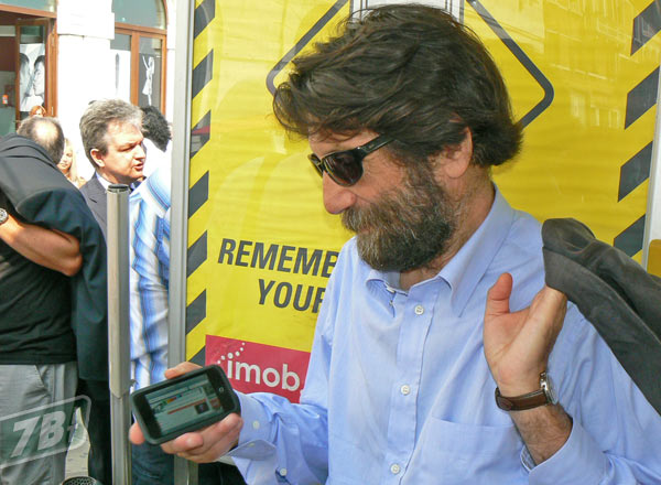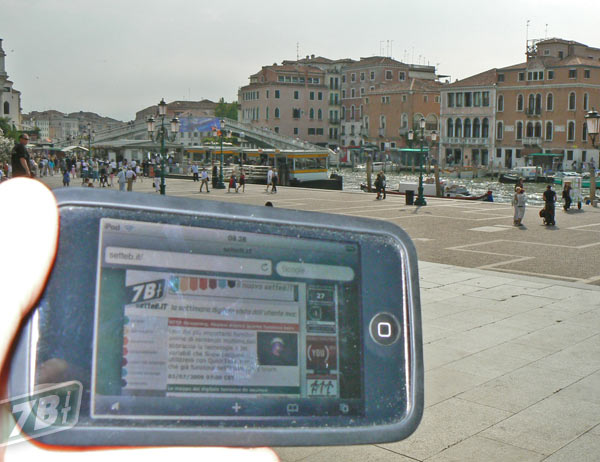 Il sindaco-filosofo Massimo Cacciari qui con setteB.IT sullo schermo di un iPod touch prima di imbarcarsi sul battello che ci porterà in giro per Venezia a testare i punti d'accesso senza fili.
