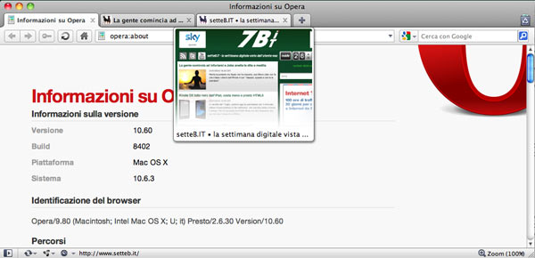 Anche Opera, come Safari, ha aggiunto l’opzione di Bing tra i motori di ricerca ed i suggerimenti istantanei di Wikipedia. Le miniature di altri tab aperti possono essere visualizzate passando sopra il mouse oppure, allungando l’altezza degli stessi.