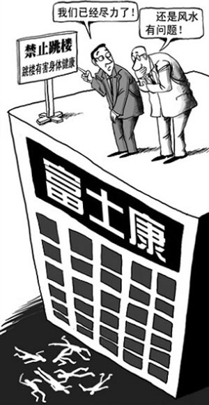 Aggiornamento del 23/05/2010: la vignetta illustrata accanto mostra un cartello in cima al un palazzo di Foxconn dove si legge “sono vietati i suicidi”. Il dirigente di Foxconn indica il cartello e dice che è stato fatto il massimo per risolvere il problema. L’altro risponde che il problema potrebbe essere il Feng shui.