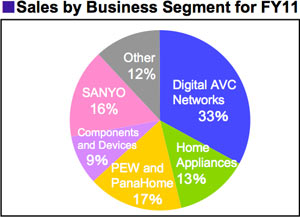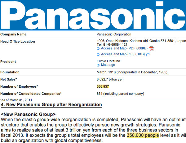 L’azienda che pagava 366.937 dipendenti, al 31 marzo scorso, pianifica di tenerne “solo” 350.000 entro l’anno fiscale 2013. La riorganizzazione del personale (che costerà 160 miliardi di yen, circa 1,3 miliardi di euro) mira ad eliminare le sovrapposizioni provenienti in gran parte dall’assorbimento di Sanyo, comperata nel 2009 da Panasonic e che rappresenta ora il 19% del business dell’anno fiscale 2011.