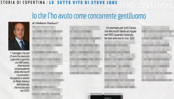 L’ottimo articolo d’apertura di Giorgio Ieranò è veramente consigliabile, c’è un parallelo dell’inconsapevole CEO di Apple con la letteratura di Sofocle, niente di meno. Assolutamente interessante anche la lettura del parere da esperta di Melania Rizzoli, che spiega la visione da ex ammalata di tumore (naturalmente dando per scontato che Jobs ne sia ancora affetto, nessuno lo sa con certezza).