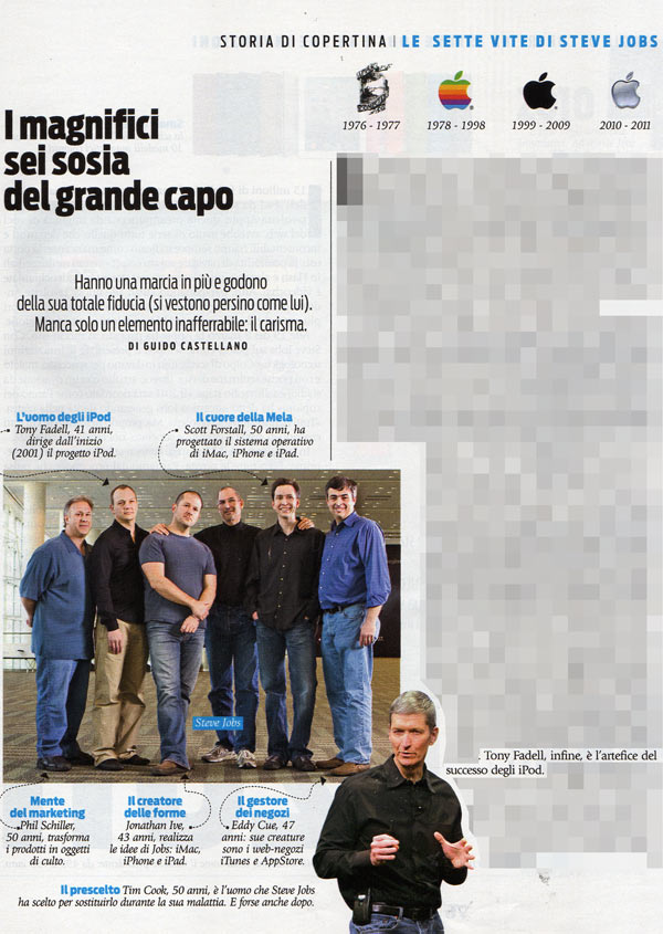 Nella lista dei dirigenti che più rendono Apple una realtà solida, anche senza Steve Jobs, l’articolista dimentica come minimo Ron Johnson, che è a capo del settore Apple Store e Bob Mansfield, il responsabile dell’hardware (e non software come ha scritto un altro magazine economico, decisamente più distratto, qualche giorno fa).