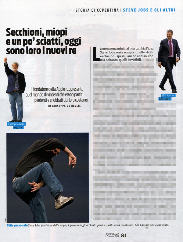 Chiude il gruppo di articoli che Panorama dedica a Steve Jobs un riempitivo sui nerd. Giuseppe de Bellis, uno che se ne intende di immagini indiscrete e scriveva così delle foto del National Enquirer, ci assicura che Steve Jobs “resta sempre quello dagli occhialoni spessi, anche adesso che usa soltanto quelli invisibili”. Prima degli attuali occhiali alla “John Lennon” con montatura metallica tonda e sottile Jobs non indossava occhiali, semplicemente, basta vederlo in qualche foto d’annata. Chiedere a Bill Gates se per caso non era lui che li aveva, magari con il nastro isolante bianco sopra al naso, come l’iconografia ha sempre dipinto la categoria dei nerd (secchioni ed imbranati). Quelli veri.