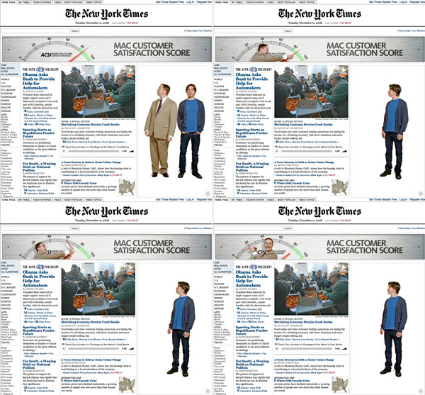 Oggi sulla home page del New York Times abbiamo trovato il banner in testata e lo skyscraper laterale che mostrano una divertente scenetta tra Mac e PC. Tutto fornito dagli specialisti di PointRoll.