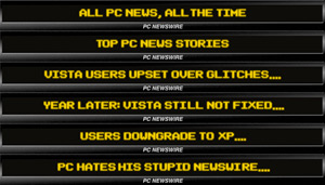 PC è invidioso di tutte le notizie pubblicate su Mac e allora ecco la trovata, piazzare un grande pannello luminoso sul quale possono scorrere i titoli più aggiornati delle notizie su PC. Purtroppo non ne arriva una buona e, nonostante PC legga i titoli indicandoli con il dito (da destra a sinistra), questi recitano: "utenti di Vista arrabbiati per i malfunzionamenti", "un anno dopo Vista non è stato ancora sistemato", "gli utenti tornano a XP" e infine "PC odia il suo stupido pannello di notizie".