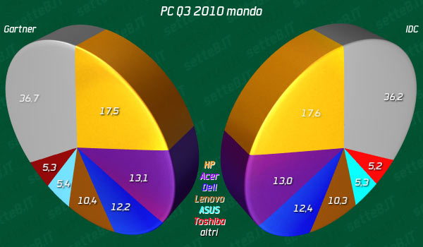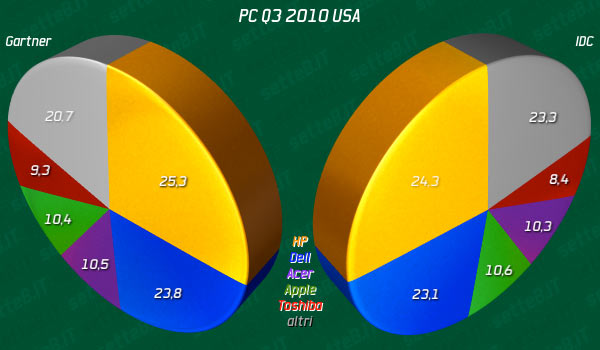 Secondo Gartner sale al primo posto HP al 25,3% con 4.459.473 PC venduti (+2%). Arretra al secondo Dell al 23,8% con 4.188.688 PC venduti (-5,8%). Acer è al terzo posto con il 10,5% e 1.848.511 PC venduti (-21%). Apple è ancora quarta con il 10,4% e 1.831.664 Mac venduti (+10,4%). Infine Toshiba al quinto con il 9,3% e 1.629.100 PC venduti (+14,2%). Altri produttori raggiungono il 20,7% (+20,2%) con 3.650.807 PC, che porta il totale a 17.608.242 unità (+2,2%).