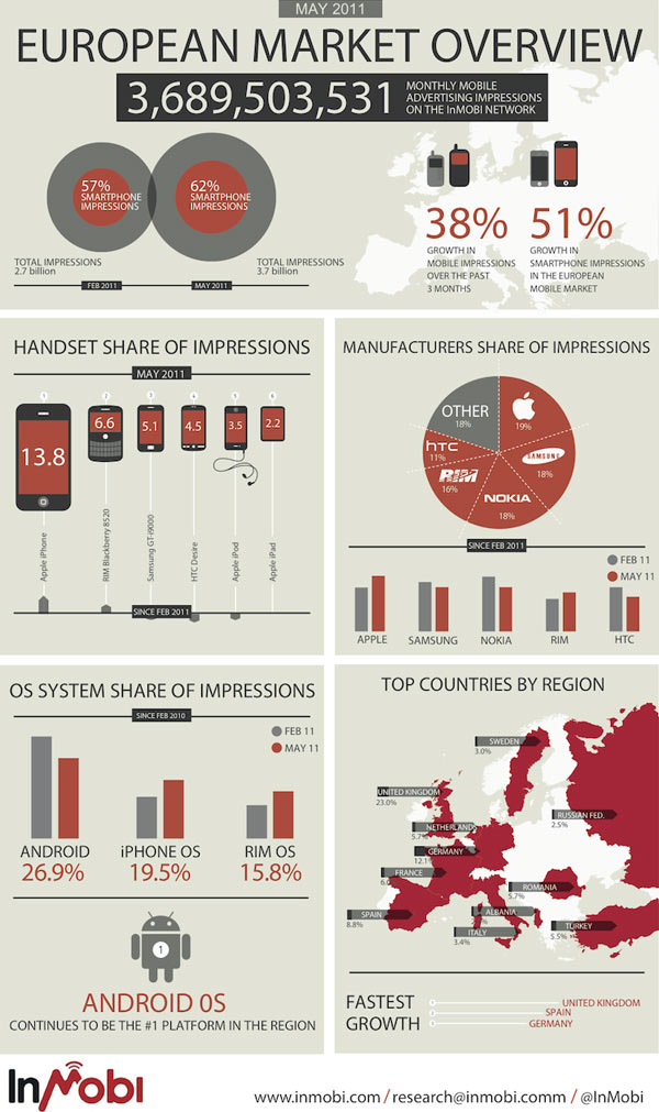Secondo InMobi (segnalato da paidContent), uno di questi network di banner pubblicitari, Apple è stata leader anche in Europa nel mese di maggio, con il 19% sui 3,7 miliardi di impression registrate sui dispositivi mobile (+51%).