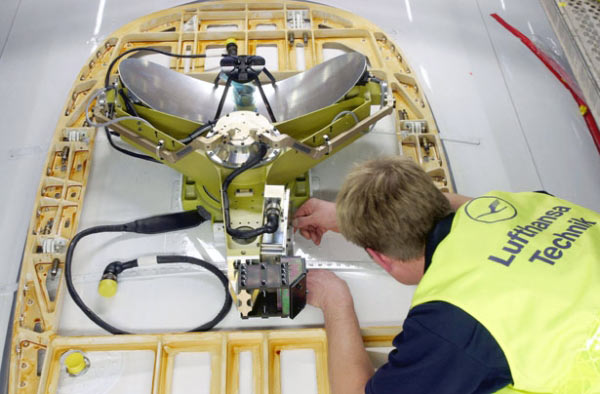 Qui sotto vediamo un tecnico Lufthansa mentre installa un’antenna satellitare per la banda Ku, che sarà sfruttata dagli apparati Panasonic Avionics con il pacchetto eXConnect, scelto dalla compagnia tedesca.
