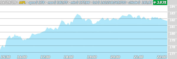 Alla chiusura delle contrattazioni di mezz'ora fa il titolo AAPL metteva in cassaforte un rialzo del 3,83%, per un prezzo finale di 181,87 dollari ed avendo pure toccato i 182,75 dollari nel corso della giornata.
