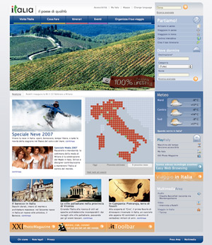 Il portale "Italia – il paese di qualità" si presenta subito con uno splash screen in Flash, in video e in audio, con un vocalizzo operistico modello Figaro. Poi un altro filmato Flash con alcune immagini stereotipate ma comunque sgranate e un annuncio nelle varie lingue… la ricerca della parola "skip" è spasmodica. Prima dei contenuti del sito perché non goderci ancora un'altra pesante animazione della mappa d'Italia corredata da una imperfetta impaginazione di alcune componenti? Dopo aver scelto se essere informati in italiano, inglese, tedesco o cinese (francese e spagnolo, no? ndr), finalmente i contenuti.