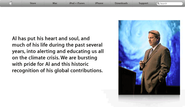 Aggiornamento del 12/10/2007: in serata la home page di apple.com (solo questa, quella delle altre nazioni continua a mostrare i prodotti di Apple) ha mostrato la foto del consigliere Al Gore con la seguente dedica "in questi ultimi anni Al ha donato anima e corpo dedicando gran parte della sua vita tentando di avvisarci ed educarci sulla crisi del clima. Siamo estremamente orgogliosi di Al e del riconoscimento storico che gli è stato dato per il suo impegno nella causa globale".