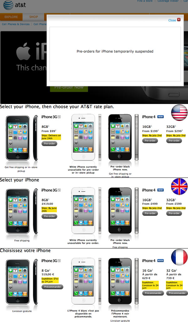 Negli Stati Uniti AT&T, il carrier che ha ancora l’esclusiva sugli smartphone di Apple, ha interrotto le prenotazioni da parte dei clienti (che a volte ricevevano risposte su account di altri), ieri sarebbe stato “il giorno più intenso per le vendite online nella storia di AT&T, chi lo ordina adesso non lo riceverà prima del 25 giugno“. Apple ha fatto lo stesso per il giorno 24 giugno, giovedì prossimo.