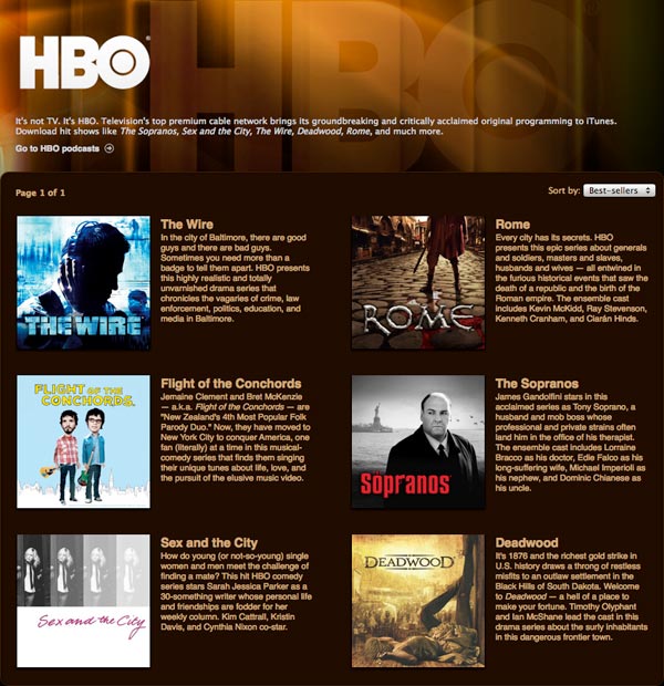 13/05/2008: oggi pomeriggio Apple ha ufficializzato l'arrivo di HBO su iTunes Store. Ora gli spettacoli TV sl negozio multimediale di Apple sono 800 con 20.000 episodi. Finora Apple ha venduto oltre 150 milioni di puntate.
