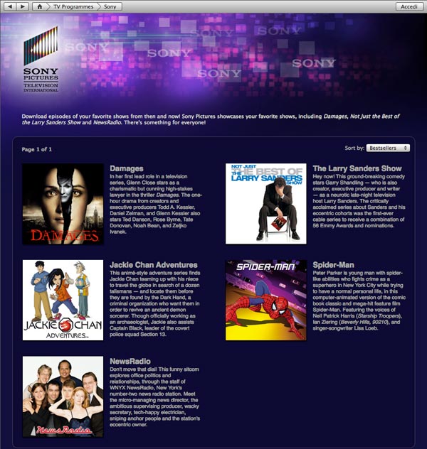 Nasce anche la sezione dei programmi di Sony Pictures, che presenta cinque produzioni. Una era già in vendita su iTunes Store da febbraio, "Damages" è anche l'unica serie televisiva attuale, trasmessa da BBC One in Gran Bretagna. Le altre arrivano dagli archivi.