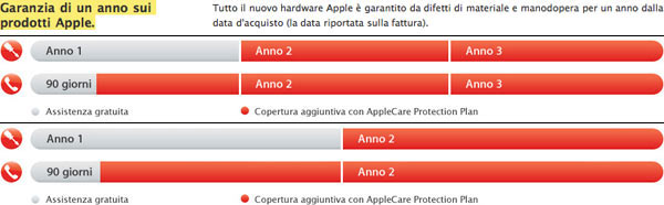 Il produttore californiano insiste a sbandierare la garanzia di 1 anno, pur precisando sibillinamente che “questa garanzia si aggiunge a quella di legge“. Ovvero che è il venditore a dover assicurare la garanzia per il secondo anno, anche se questo è Apple stessa con i suoi Apple Store (negozi ed ordini online/telefonici).