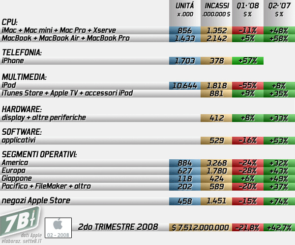 L'azienda di Cupertino ha fatturato per 7,51 miliardi di dollari nel secondo trimestre del 2008, ovvero il 43% in più di quanto realizzato nel secondo trimestre del 2007 e migliore dei 6,8 miliardi di dollari stimati dal CFO Peter Oppenheimer.