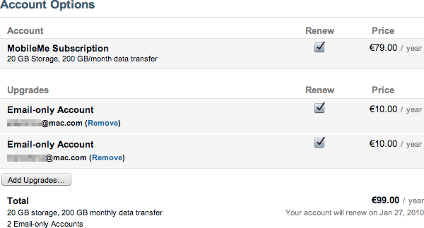 Come vedete dallo screenshot che ci ha cortesemente inviato il lettore, attraverso il pannello dei rinnovi online di MobileMe, l’ordine effettuato era per un abbonamento più due account di sola posta elettronica. Totale 99 euro.