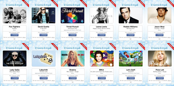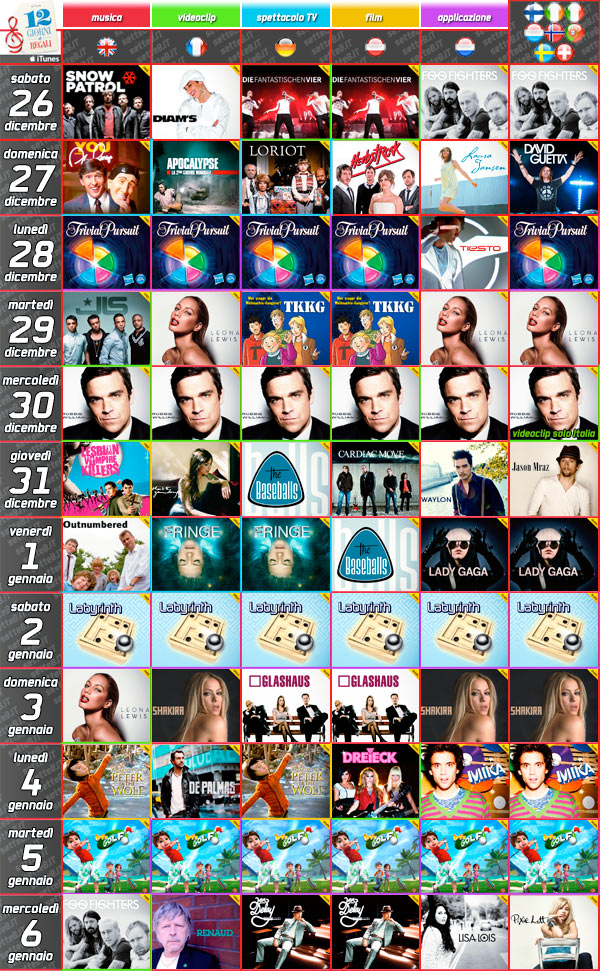 Questa è la lista completa dei file regalati in Italia in tutti e 12 i giorni, 3 giochi, 8 canzoni ed un videoclip registrato live: