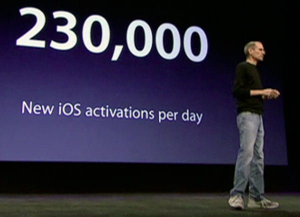 Erano 160.000 al giorno in giugno, poi salite in agosto a 200.000. Ma Steve Jobs non ci credeva e rilanciava con le 230.000 nuove attivazioni dei dispositivi iOS (che non sono tutti iPhone) per ogni giorno.