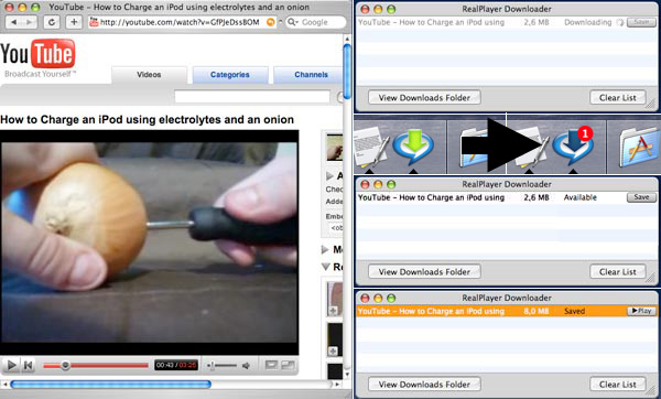 Basta aprire RealPlayer con relativo agent e navigare normalmente dal browser attraverso le pagine Internet e quando si incontrano filmati Flash il RealPlayer Downloader comincia a mettere nella cache il file, poi l'icona del player nel dock indica il numero di quanti filmati è possibile salvare, cliccando "save" nella finestra apposita il video si materializza nella cartella dei Filmati e, al termine, è possibile rivederlo offline sul proprio Mac.