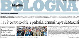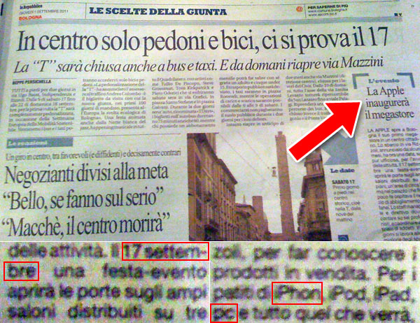 Il giornale affianca, forse non a caso, la notizia dell’Apple Store a quella della pedonalizzazione della Zona T (via Rizzoli, via Ugo Bassi, via Indipendenza), ovvero il centro di Bologna, con un test, guarda caso, proprio il 17 e 18 settembre.