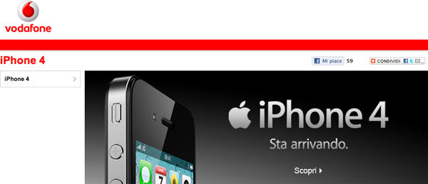 In serata il sito italiano di Vodafone ha aggiunto la schermata scura relativa all’arrivo dell’iPhone 4.