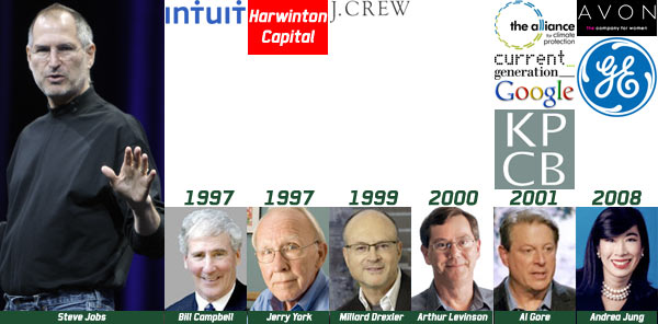 Ecco i consiglieri, con l’anno d’ingresso in Apple e le altre loro collaborazioni, a vari livelli: Bill Campbell, Millard Drexler, Al Gore, Andrea Jung, Arthur Levinson (l’ex CEO di Genentech è rimasto nel board di Apple, preferendo lasciare Google), Jerry York e naturalmente il CEO Steve Jobs.