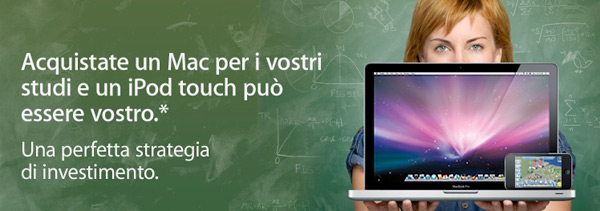 00000a_fotonews001Apple rimborsa gli studenti del prezzo di un iPod a scelta, se acquisteranno entro l'8 settembre un MacBook, MacBook Air, MacBook Pro, iMac o Mac Pro.