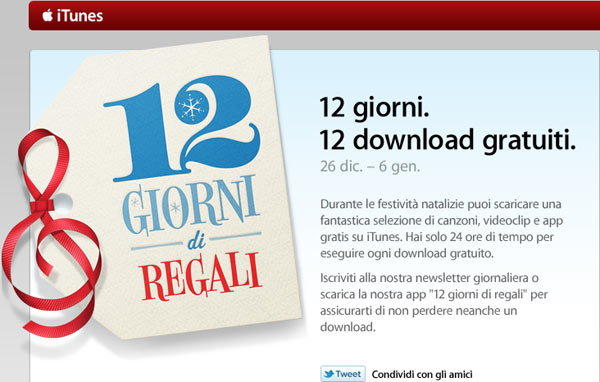 Apple rilancia anche per questa fine d’anno l’applicazione 12 giorni di regali che regalerà canzoni, video oppure applicazioni tra il 26 dicembre ed il 6 gennaio.