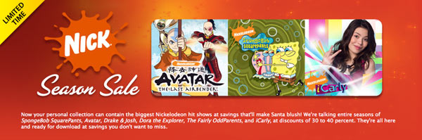 Per un periodo limitato gli spettacoli televisivi più amati dai piccoli sono in offerta su iTunes. Dal canale Nickelodeon del gruppo Viacom arriva una selezione di una ventina tra cartoni animati o sitcom a prezzo scontato. Apple promuove il Nick season sale con sconti per intere stagioni che si aggirano attorno al 30 o 40% del prezzo intero. Con una spesa variabile tra 7 e 21 dollari si possono scaricare le annate di "SpongeBob SquarePants", "Avatar", "Drake & Josh", "Dora the explorer" e tanti altri.