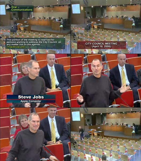 Di seguito alcune immagini della sequenza televisiva dell'intervento di Steve Jobs al consiglio comunale.