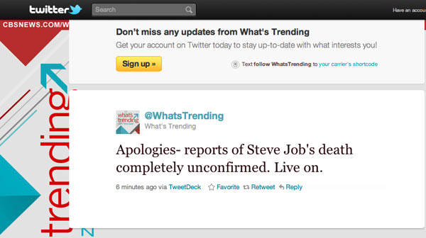 Venerdì sera l’account Twitter del programma online “What’s trending“, del gruppo CBS e prodotta da Shira Lazar per la sua Disrupt, ha pubblicato un messaggio con il quale si annunciava la morte di Steve Jobs.
