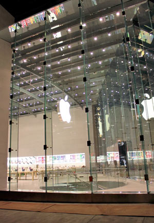 La grande ed alta facciata in cristallo svela uno spazio unico (quasi 800 metri quadrati) dell'interno del negozio, ampio e luminoso. Varie file di tavoli di legno e le mensole ai lati con i prodotti di Apple esposti.
