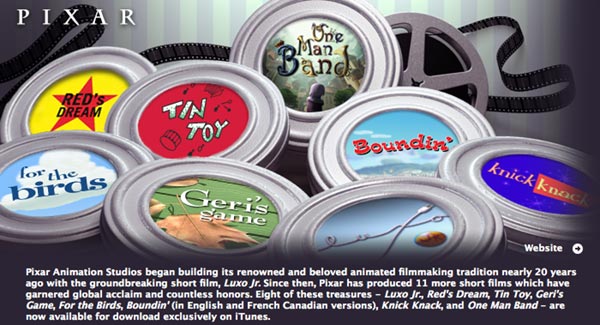 Ma consoliamoci, sono cambiate molte cose per i mini-film d'animazione di Pixar sugli iTunes Store internazionali: le nazioni con più lingue nazionali (tipo Svizzera, Olanda, Belgio e Canada) o quelle molto importanti (come Francia, Germania e Giappone) perdono le versioni doppiate o in francese o in tedesco o in giapponese, che erano state approntate per alcuni cortometraggi, tipicamente Boudin', ma non solo.
