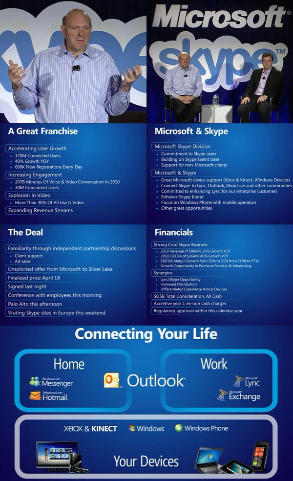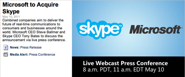 Aggiornamento del10/05/2011: poco dopo le ore 14 Microsoft ha confermato l’acquisto di Skype per 8,5 miliardi di dollari. Microsoft continuerà a tenere aggiornato Skype per piattaforme diverse da quelle di Microsoft. Il CEO di Skype Tony Bates diventa presidente della nuova divisione Microsoft Skype. Alle ore 17 (italiane) è prevista la conferenza di presentazione.