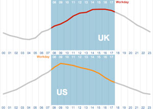 La fascia orario che in USA più è carica di spam è quella che va tra le 9 e le 10 del mattino, proprio all'inizio della giornata lavorativa e creando le maggiori difficoltà e perdite di tempo a scremare quello che è utile da quello da buttare. In Europa lo spam è spalmato in vari orari, si vedano i grafici a lato, relativi a Stati Uniti e Gran Bretagna.