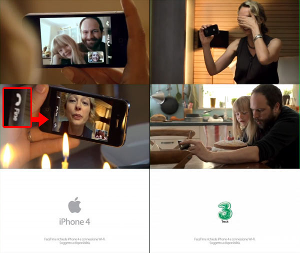 Apple, come abbiamo già avuto modo di notare, ha avuto la finezza di tradurre il menu che conclude la videochiamata nelle varie lingue dei relativi paesi dove stanno andando in onda queste pubblicità. In Italia si legge “fine”.