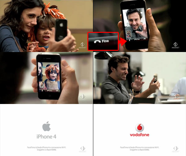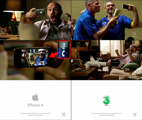 Le pubblicità “italianizzate” non parlano la nostra lingua o mostrano situazioni particolarmente italiane (a parte una squadra con la maglia azzurra) ma hanno i menu che si vedono nell’iPhone 4 con FaceTime tradotti nella nostra lingua: “fine” si vede dove bisogna premere per terminare la videochiamata. Lo stesso starebbe succedendo con la traduzione dei menu nelle varie nazioni dove sono in onda i medesimi spot.