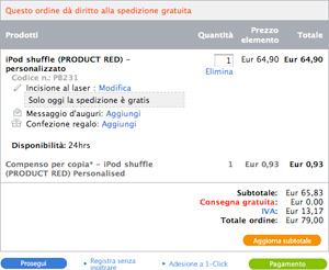 Non è possibile dire per quanto tempo durerà tutto ciò ma se qualcuno vuole approfittare può risparmiare i circa 8 euro che solitamente vengono applicati per piccoli ordini, come per esempio quello di un iPod shuffle, dal costo di 79 euro.