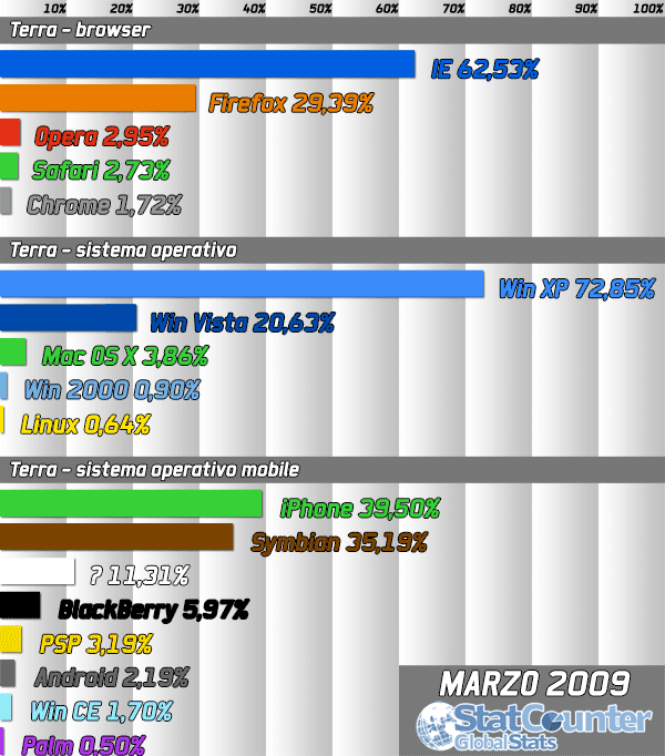 IE negli Stati Uniti e Canada totalizza il 65,41% (aveva il 69,70% un mese fa), con 25,85% Firefox aumenta del 3,17% la sua presenza. Safari aveva il 4,87% in febbraio ed adesso il 5,54%. L’OS più usato Win XP passa dal 63,09 al 59,29% mentre Win Vista aumenta dal 26,77 al 29,55%. Dal 7,25% di febbraio il sistema operativo di Apple raggiunge l’8,02%. Con il 60,83% di febbraio l’iPhone era già dominante ma in marzo tocca il 62,76%. Lontanissimo ma pur sempre secondo in classifica, BlackBerry, deteneva il 12,38% il mese scorso e, guadagnando un po’, raggiunge il 12,71%.