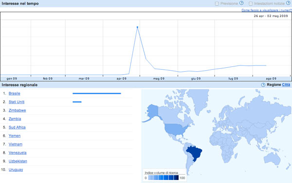 Un esempio di quello che Google ci può aiutare a capire lo si trova in questo video. Qui sotto invece il trend delle ricerche per "suine flu" (termine inglese per la febbre suina o, per i più tecnici, virus A/H1N1). Prima il caso è scoppiato in Messico e poi quasi tutti hanno voluto minimizzare l'influenza (tanto che si è imposto anche il cambio del nome) ma nei mesi successivi sono arrivati i morti e la cosa sta tornando d'attualità.