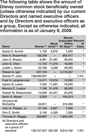 Al 9 gennaio era questa che vediamo accanto la distribuzione di quote azionarie tra i membri del consiglio Disney: il maggior detentore con 138 milioni di DIS (un valore approssimativo di 3 miliardi di dollari, Disney aveva pagato 7,4 miliardi di dollari per Pixar) per il 7,4% del totale è Jobs, seguono a grandissima distanza tutti gli altri con meno dell'1%. Il CEO Bob Iger ne ha 537 mila, il CFO Thomas Staggs 260 mila ed il responsabile dell'ufficio legale Alan Braverman 130 mila.