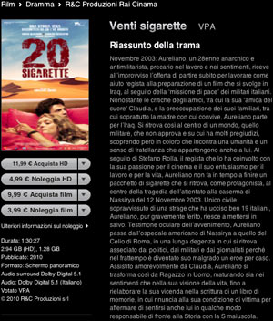 E’ arrivato un nuovo film italiano tra i 9 + 1 segnalati fino a settimana scorsa e si tratta di “20 sigarette” (R&C Produzioni RAI Cinema e non “RAI Cinama”, 2010), di Aureliano Amadei con Carolina Crescentini e Vinicio Marchioni, l’acquisto in HD costa 12 euro (10 euro in definizione standard) ed il noleggio 5 euro (4 euro in definizione standard). Arrivassero questi film in modo meno centellinato sarebbe gradito, oltre che vedere altre distribuzioni arricchire il listino ancora troppo limitato.