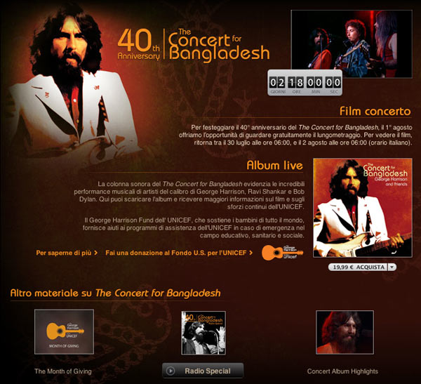 Ma tra 2 giorni e 18 ore scatterà un regalo, in streaming. Apple offrirà gratuitamente la visione e l’ascolto di The Concert for Bangladesh suonato per beneficenza, potremo goderne su iTunes Store Italia dalle ore 6 di sabato alle ore 6 di martedì mattina.