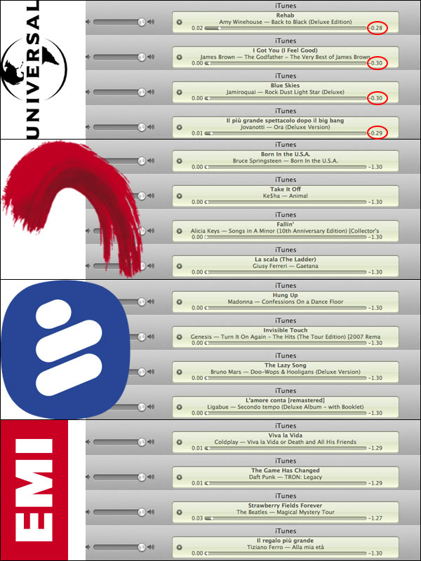 Qualche esempio? Coldplay, Daft Punk, Beatles e Tiziano Ferro sì (sono di EMI). Madonna, Genesis, Bruno Mars e Luciano Ligabue sì (sono di WMG – Warner Music Group), Bruce Springsteen, Ke$ha, Alicia Keys e Giusy Ferreri sì (sono di Sony Music). Ma Amy Winehouse, James Brown, Jamiroquai e JovanoTTi no (sono di UMG – Universal Music Group).